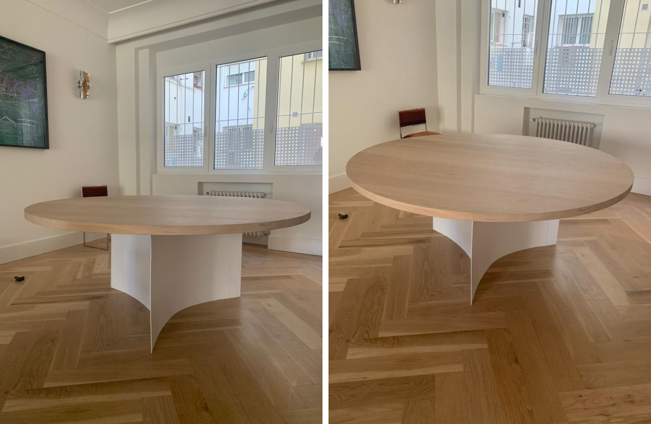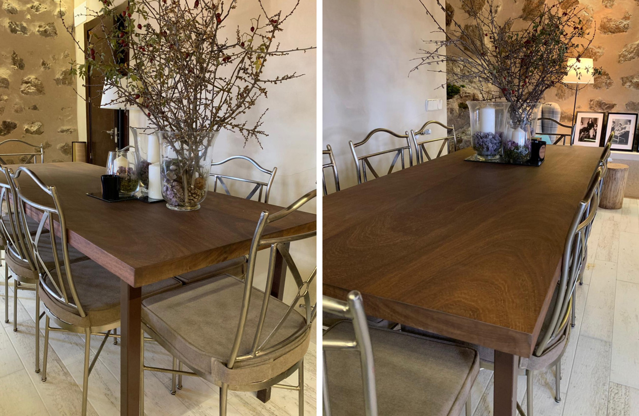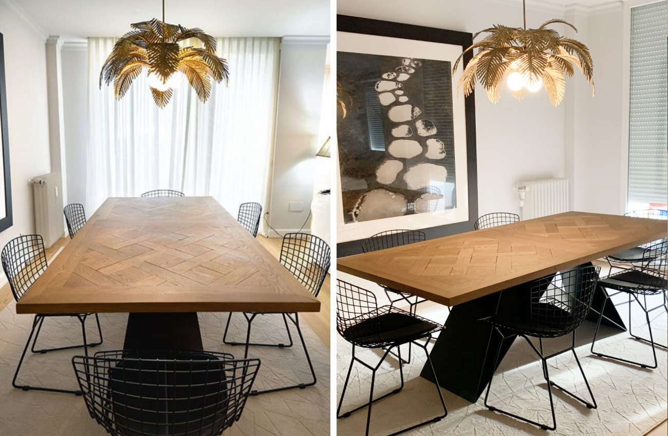En esta vivienda diseñamos una mesa de comedor con tableros recuperados de un palacio de París, inspirados en el estilo Versalles. La base, fabricada en hierro y lacada en negro, aporta un contraste moderno. Además, instalamos una tarima multicapa de 24 cm de ancho con una capa de uso de 5 mm y un acabado invisible.