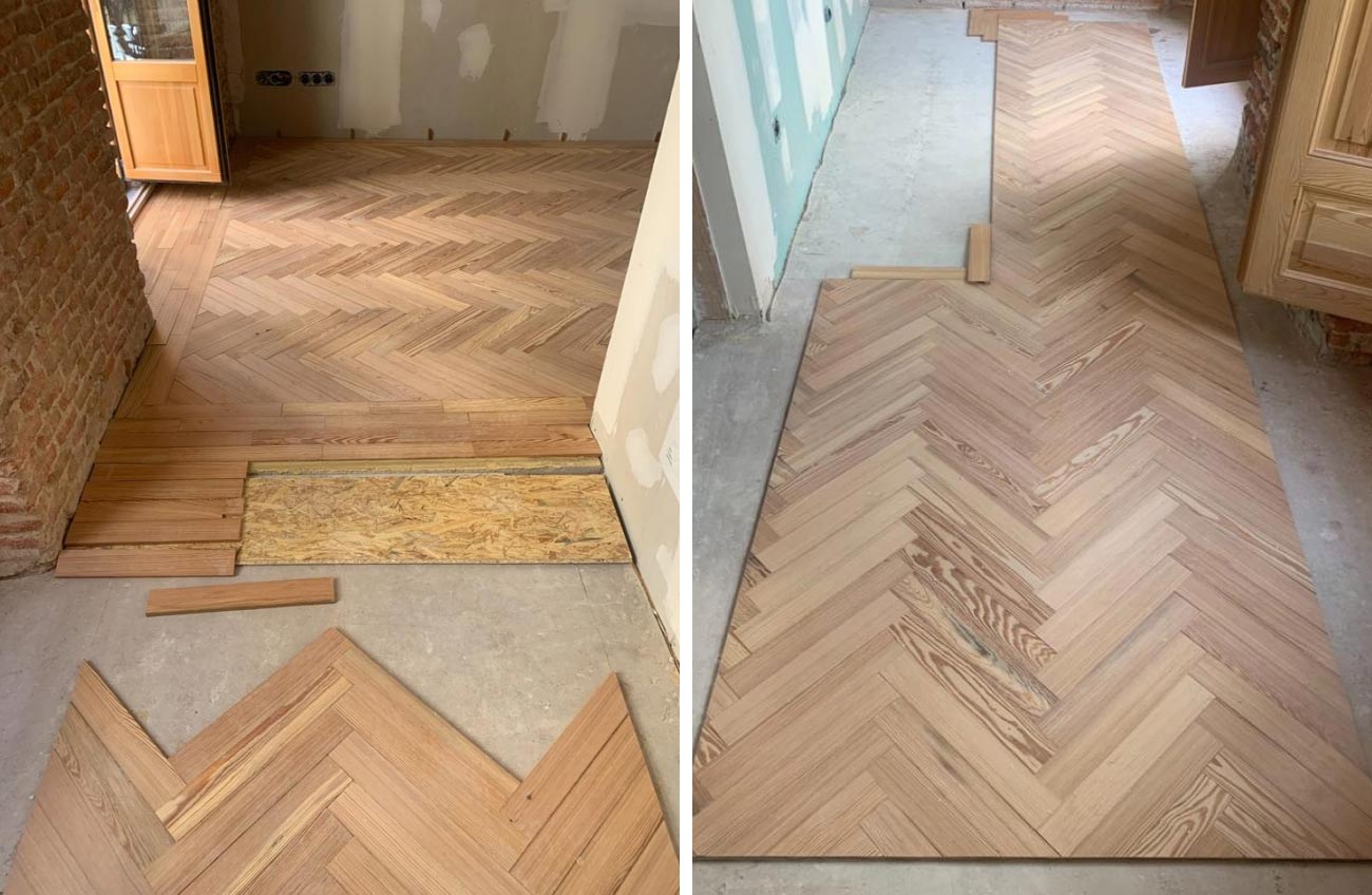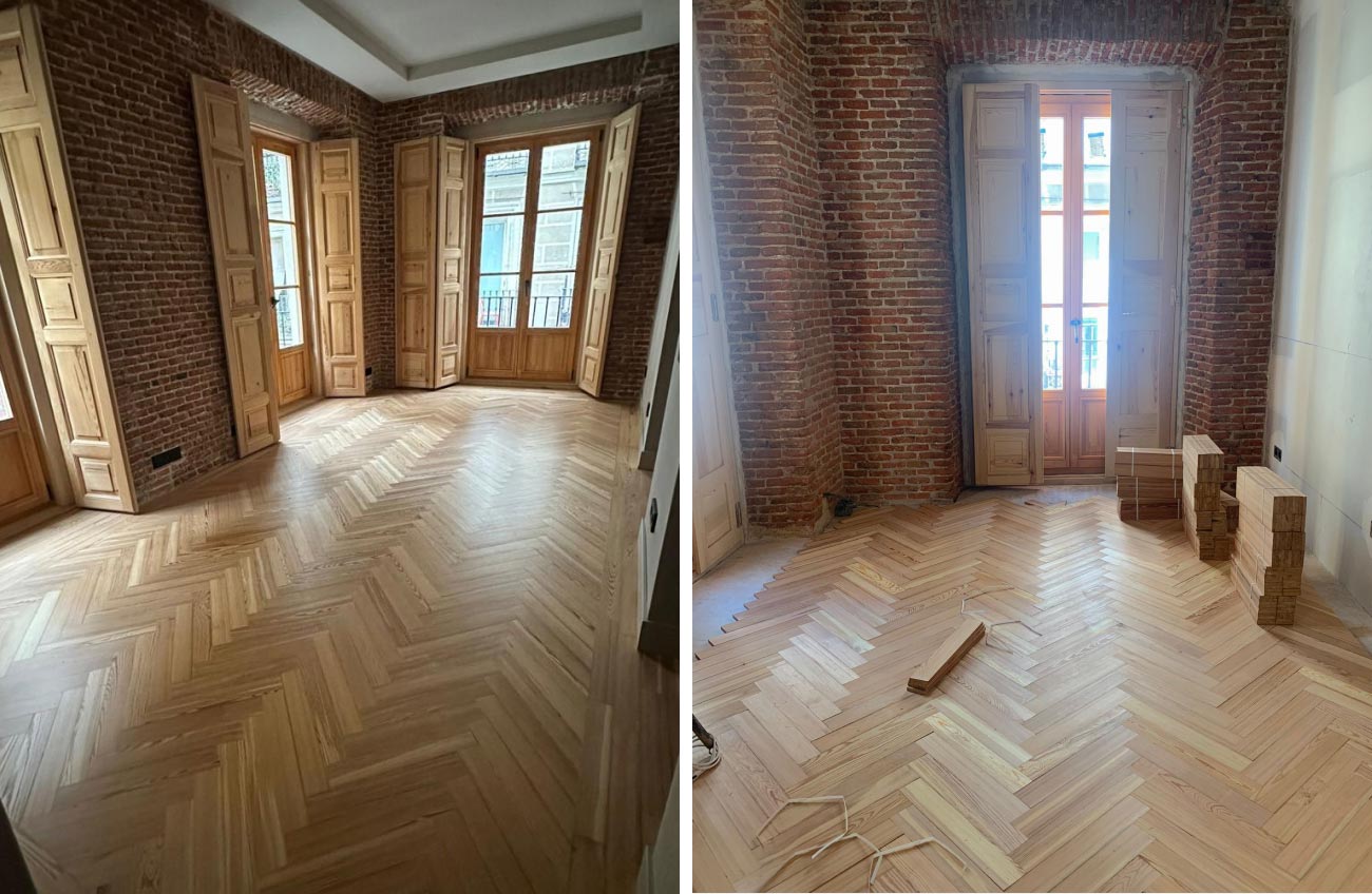 En estos apartamentos instalamos parquet de pino Melis viejo en espiga con faja perimetral, adaptado a un sistema de calefacción por suelo radiante. Se usó barniz ecológico al agua en mate para resaltar la veta natural. La madera proviene de vigas recicladas de estructuras de edificios en EE.UU.