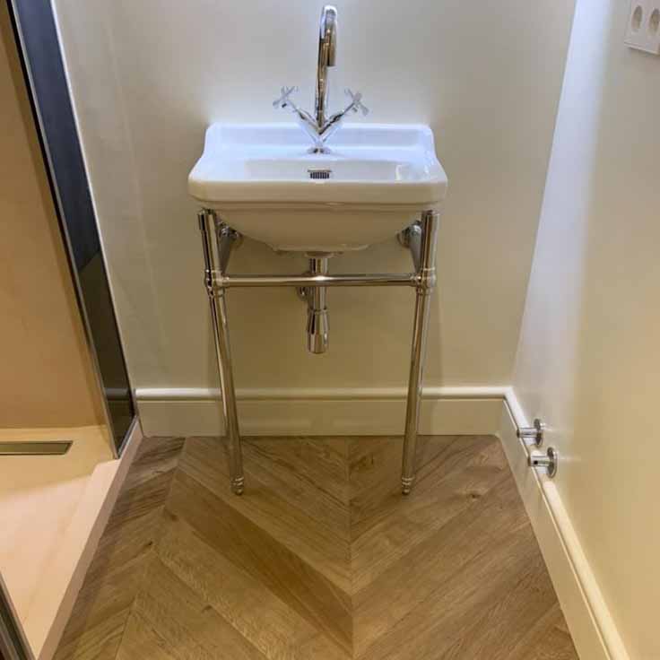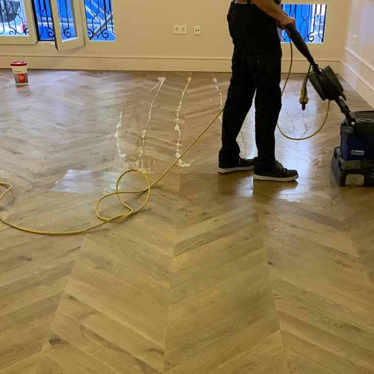 Una vez que se tapa el suelo radiante, el mortero, sobre todo en superficies grandes, no suele estar perfectamente nivelado. Esto implica que si pones una punta Hungría en tarima flotante, queden “cejas” o “juntas”, que no son posibles de reparar, ya que la tarima está ya barnizada. Con la tarima maciza, se pega a la solera y las posibles cejas, desaparecen al lijar y barnizar en obra, quedando un aspecto del suelo perfecto.